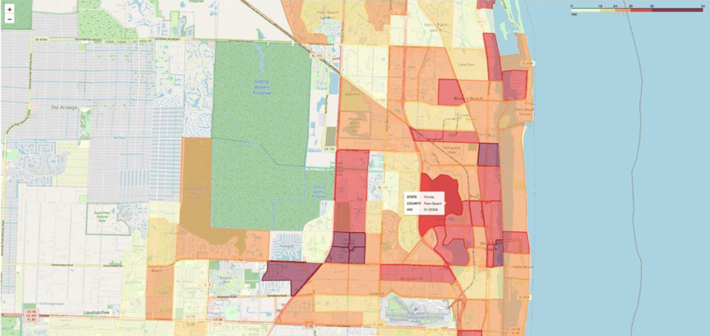 - Data from USGS satellite analysis, Census Bureau tables, and the First Street Foundation’s Heat Factor predictions